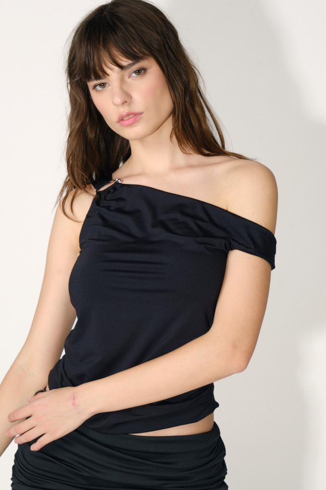Top de punto embolsado con fruncidos laterales y detalle de avío metálico