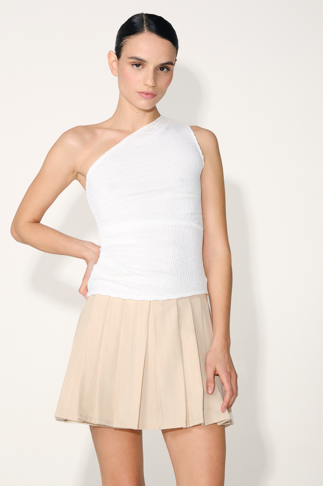 Top asimétrico de textil texturado a un hombro con pliegues en cintura y hombro. La variante blanca cuenta con forrería para evitar transparencias.