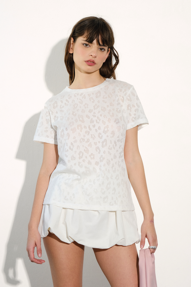 Remera regular básica de textil calado animal print y bordado de moneda marcaria en espalda.