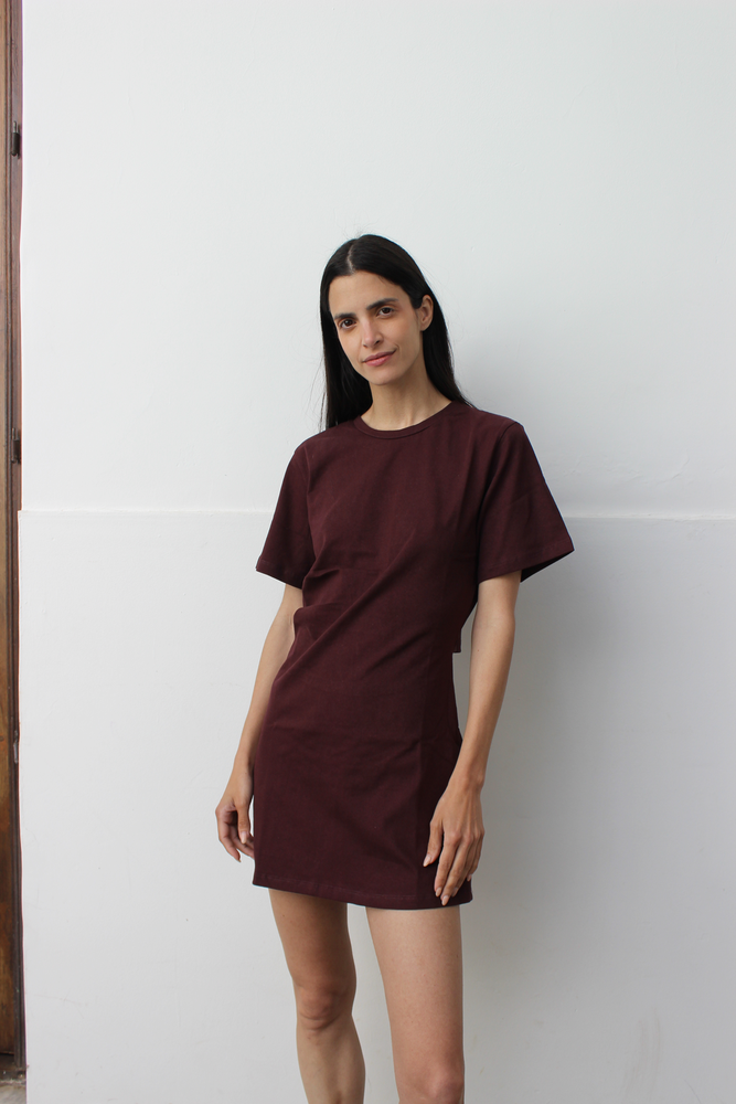 Vestido tipo remera con frunce lateral en cintura y espalda baja con abertura